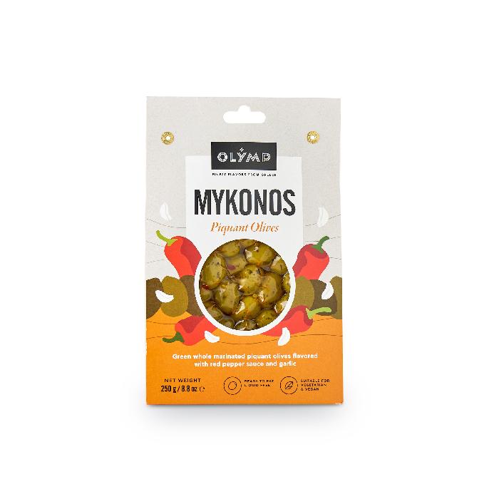 Pikantní zelené olivy s peckou, v marinádě s chilli paprikou a česnekem. Nejlepší zelené olivy z Řecka v balení bez nálevu jsou připraveny k okamžité konzumaci – ideální balení na party. Balení ve vakuu uchovává olivy ve vysoké kvalitě a čerstvé až 10 dní po otevření. Výhodné balení – více oliv snadno v pohodlném balení (250 g pevného podílu).